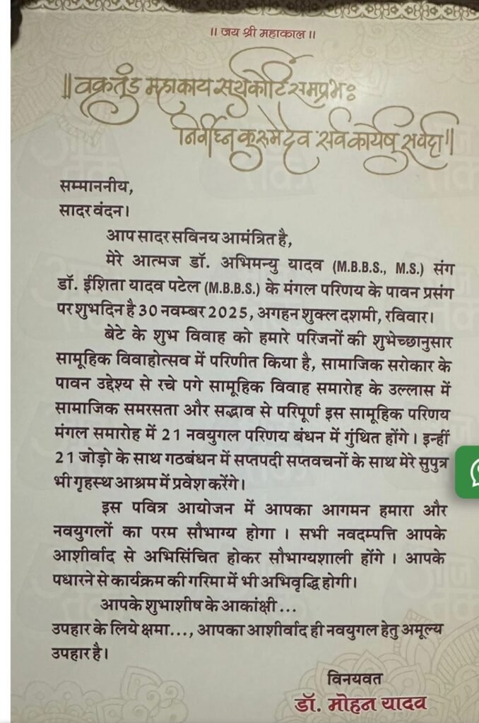 शादी के कार्ड में निमंत्रण देते हुए मुख्यमंत्री मोहन यादव ने लिखामेरे आत्मज डॉ. अभिमन्यु यादव (M.B.B.S., M.S.) संग डॉ. ईशिता यादव पटेल (M.B.B.S.) के मंगल परिणय के पावन प्रसंग पर शुभदिन है 30 नवम्बर 2025, अगहन शुक्ल दशमी, रविवार।बेटे के शुभ विवाह को हमारे परिजनों की शुभेच्छानुसार सामूहिक विवाहोत्सव में परिणीत किया है, सामाजिक सरोकार के पावन उद्देश्य से रचे पगे सामूहिक विवाह समारोह के उल्लास में सामाजिक समरसता और सद्भाव से परिपूर्ण इस सामूहिक परिणय मंगल समारोह में 21 नवयुगल परिणय बंधन में गुंथित होंगे। इन्हीं 21 जोड़ो के साथ गठबंधन में सप्तपदी सप्तवचनों के साथ मेरे सुपुत्र भी गृहस्थ आश्रम में प्रवेश करेंगे।इस पवित्र आयोजन में आपका आगमन हमारा और नवयुगलों का परम सौभाग्य होगा । सभी नवदम्पत्ति आपके आशीर्वाद से अभिसिंचित होकर सौभाग्यशाली होंगे । आपके पधारने से कार्यक्रम की गरिमा में भी अभिवृद्धि होगी।आपके शुभाशीष के आकांक्षी … उपहार के लिये क्षमा…, आपका आशीर्वाद ही नवयुगल हेतु अमूल्य उपहार है।